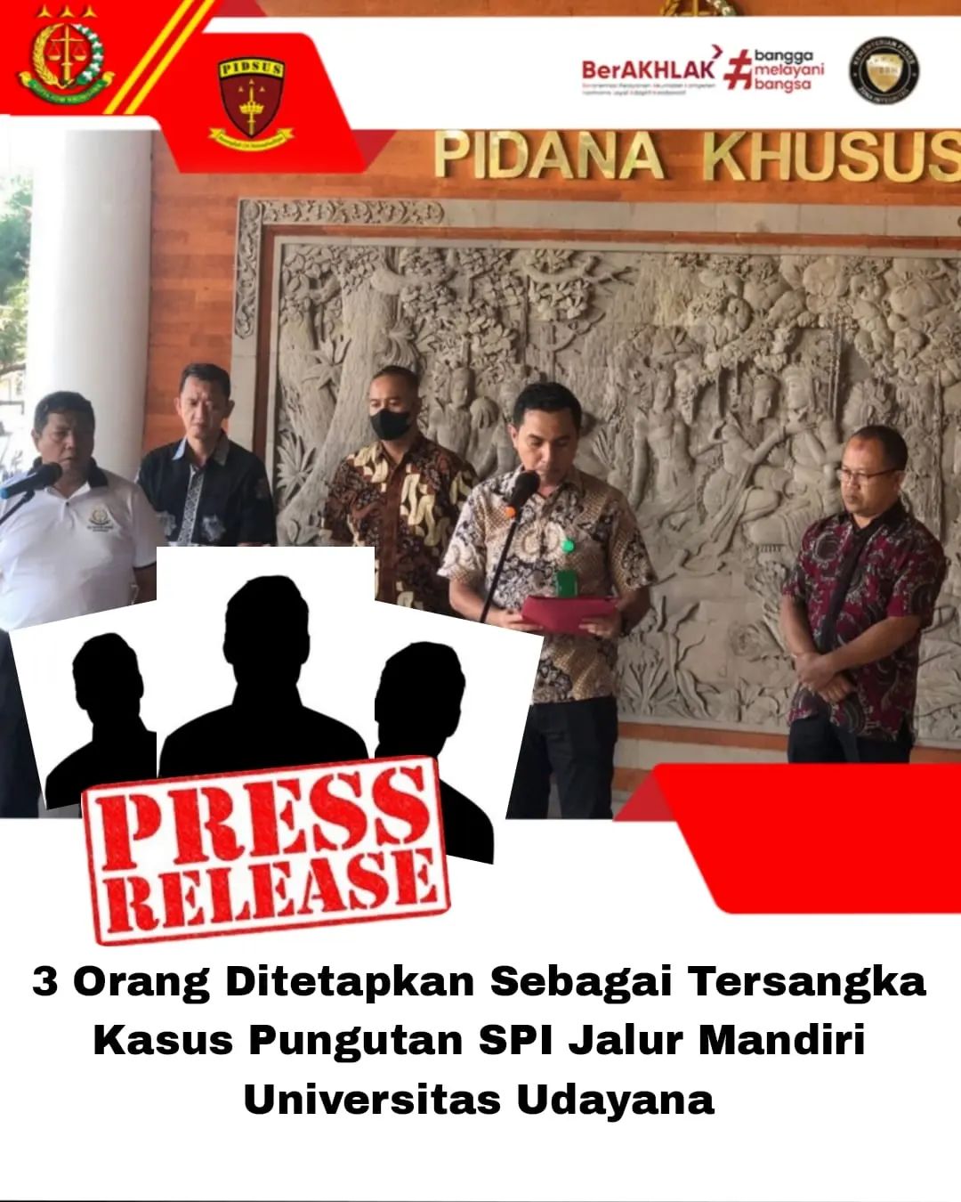 Kejaksaan Tinggi Bali Tetapkan 3 Orang Sebagai Tersangka dugaan tindak pidana korupsi Penyalahgunaan Dana Sumbangan Pengembangan Institusi (SPI) Mahasiswa Baru Seleksi Jalur Mandiri Universitas Udayana.