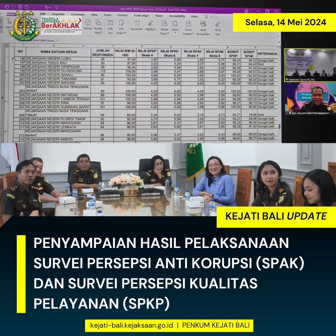 Dari Ruang Vicon Kejaksaan Tinggi Bali, Selasa, 14 Mei 2024, Asisten Pembinaan, Dr. Ni Wayan Sinaryati, S.H., M.H., Asisten Pengawasan, Susilo, S.H., beserta Koordinator, Kasi & Tim Kerja dari Perencanaan mengikuti kegiatan Penyampaian Hasil Survey Persepsi Anti Korupsi (SPAK), Survey Persepsi Kualitas Pelayanan (SPKP) & Survey Kepuasan Masyarakat (SKM) secara virtual.