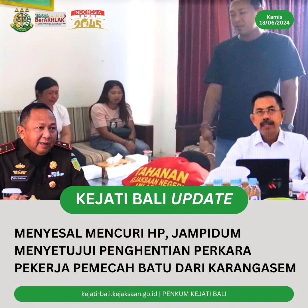 Kamis, 13 Juni 2024, pemaparan permohonan penghentian penuntutan berdasarkan keadilan Restorative Justice dilakukan oleh Kepala Kejaksaan Tinggi Bali, Dr. Ketut Sumedana, S.H., M.H., secara virtual, didampingi Para Kasi pada bidang Tindak Pidana Umum Kejati Bali. Perwakilan dari Kejaksaan Negeri Karangasem juga hadir memaparkan bahan penghentian penuntutan secara virtual.