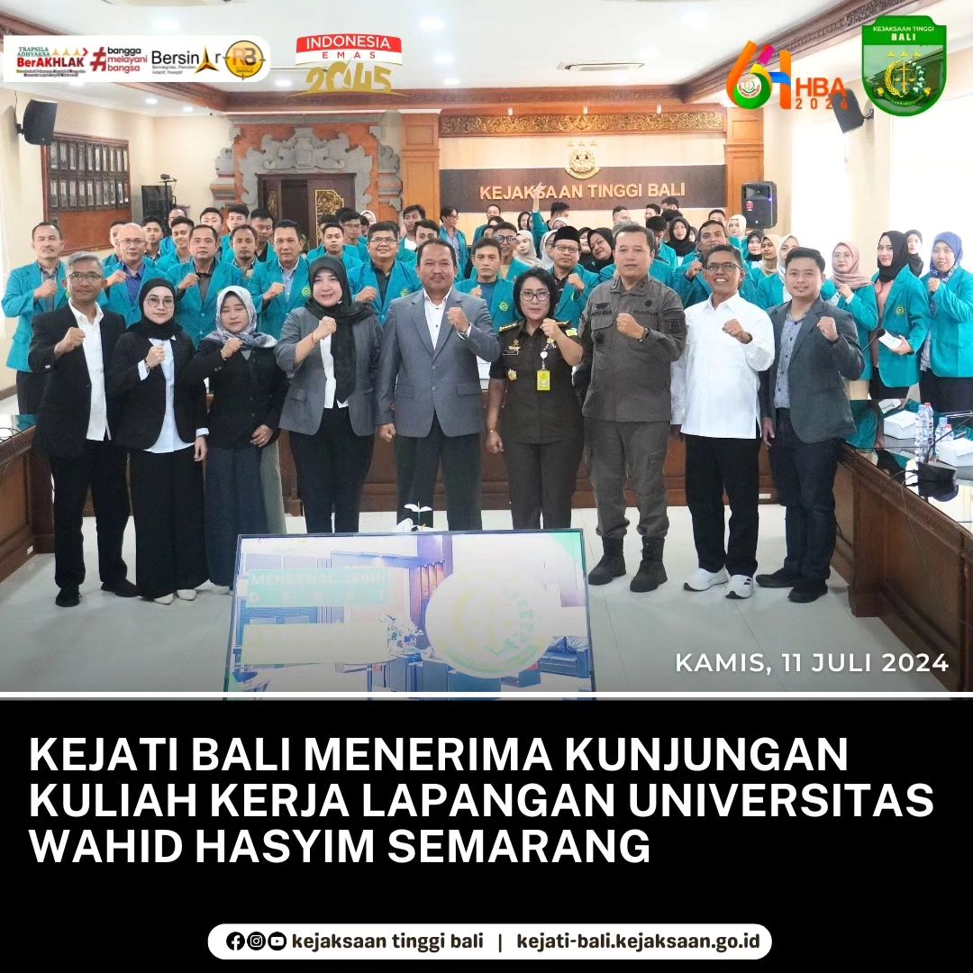 Bertempat di Aula Sasana Dharma Adhyaksa Kejati Bali, Mahasiswa Fakultas Hukum Universitas Wahid Hasyim Semarang melakukan Kuliah Kerja Lapangan (KKL) dan Studi Banding di Kejaksaan Tinggi Bali, pada hari Kamis, 11 Juli 2024.