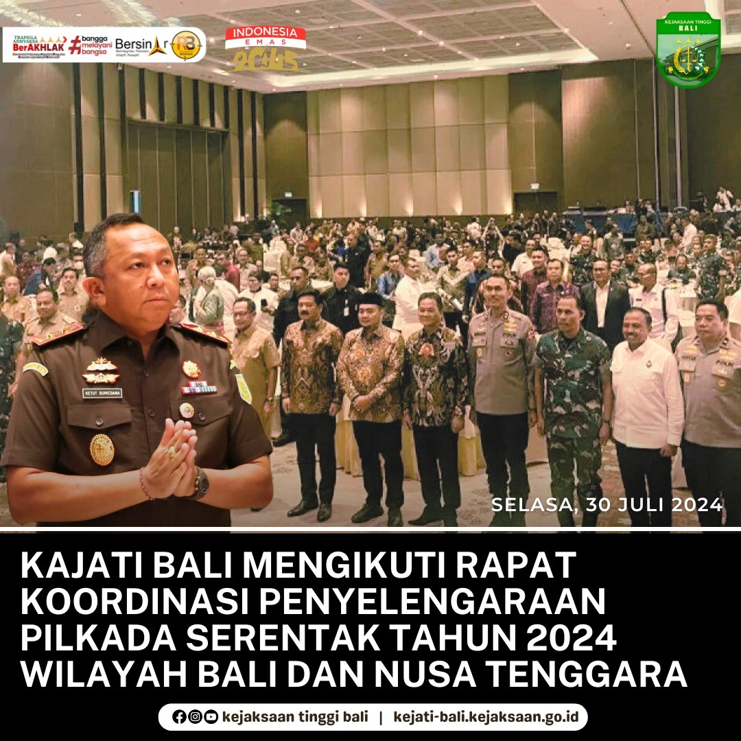 Kepala Kejaksaan Tinggi Bali, Dr. Ketut Sumedana, S.H., M.H., bersama dengan Asisten Intelijen, Chandra Purnama, S.H., M.H., dan Kepala Kejaksaan Negeri se-Bali, mengikuti rapat koordinasi penyelenggaraan pilkada serentak tahun 2024 wilayah Bali dan Nusa Tenggara, bertempat di Pecatu Hall, Bali Nusa Dua Covention Centre, Bali. pada hari Selasa, 30 Juli 2024.