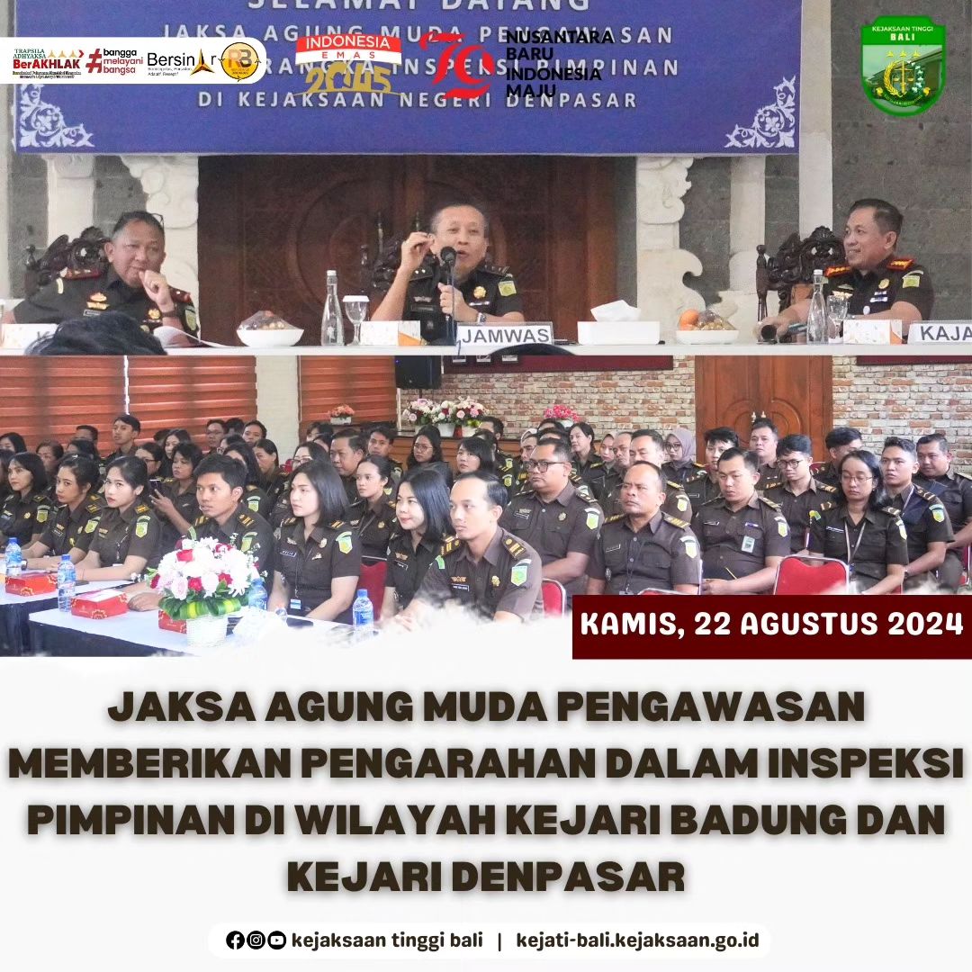 Hari Kamis tanggal 22 Agustus 2024, Jaksa Agung Muda Pengawasan Kejaksaan Agung Republik Indonesia, Dr. Ali Mukartono S.H., M.M., Kepala Kejaksaan Tinggi Bali, Dr. Ketut Sumedana, S.H., M.H., beserta rombongan tim inspeksi, memberikan pengarahan dalam rangka inspeksi pimpinan di Kejaksaan Negeri Badung dan Kejaksaan Negeri Denpasar.