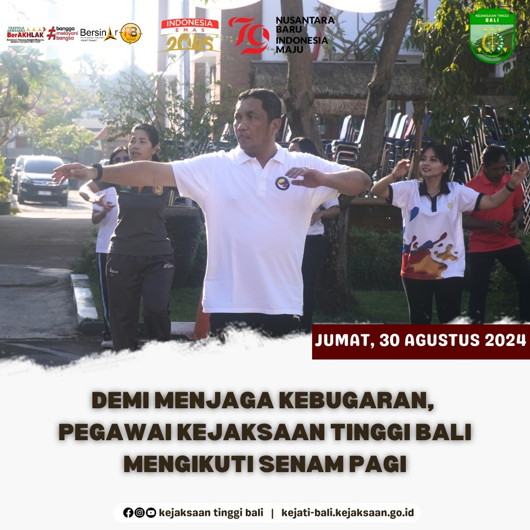Hari ini, Jumat, 30 Agustus 2024, Kejaksaan Tinggi Bali kembali menggelar senam pagi dalam rangka menjaga kebugaran tubuh. Para Asisten beserta staf, tenaga honorer Kejaksaan Tinggi Bali, serta mahasiswa magang, turut memeriahkan kegiatan Senam Pagi bertempat di Halaman Kejaksaan Tinggi Bali.