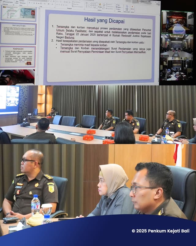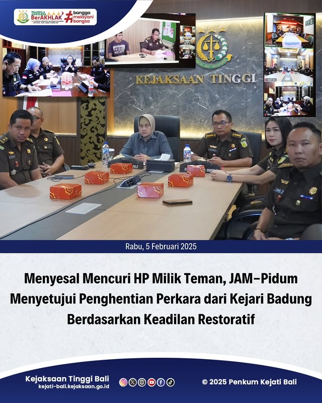 Rabu, 5 Februari 2025, pemaparan permohonan penghentian penuntutan berdasarkan keadilan Restorative Justice dilakukan oleh Wakil Kepala Kejaksaan Tinggi Bali, Dr. Lila Agustina, S.H., M.H., M.Kn., secara virtual dari ruang rapat Kejaksaan Tinggi Bali, didampingi Asisten Tindak Pidana Umum Kejati Bali, Chandra Eka Yustisia, S.H., M.H., Koordinator beserta para Kasi. Perwakilan dari Kejaksaan Negeri Badung juga hadir memaparkan bahan penghentian penuntutan secara virtual.