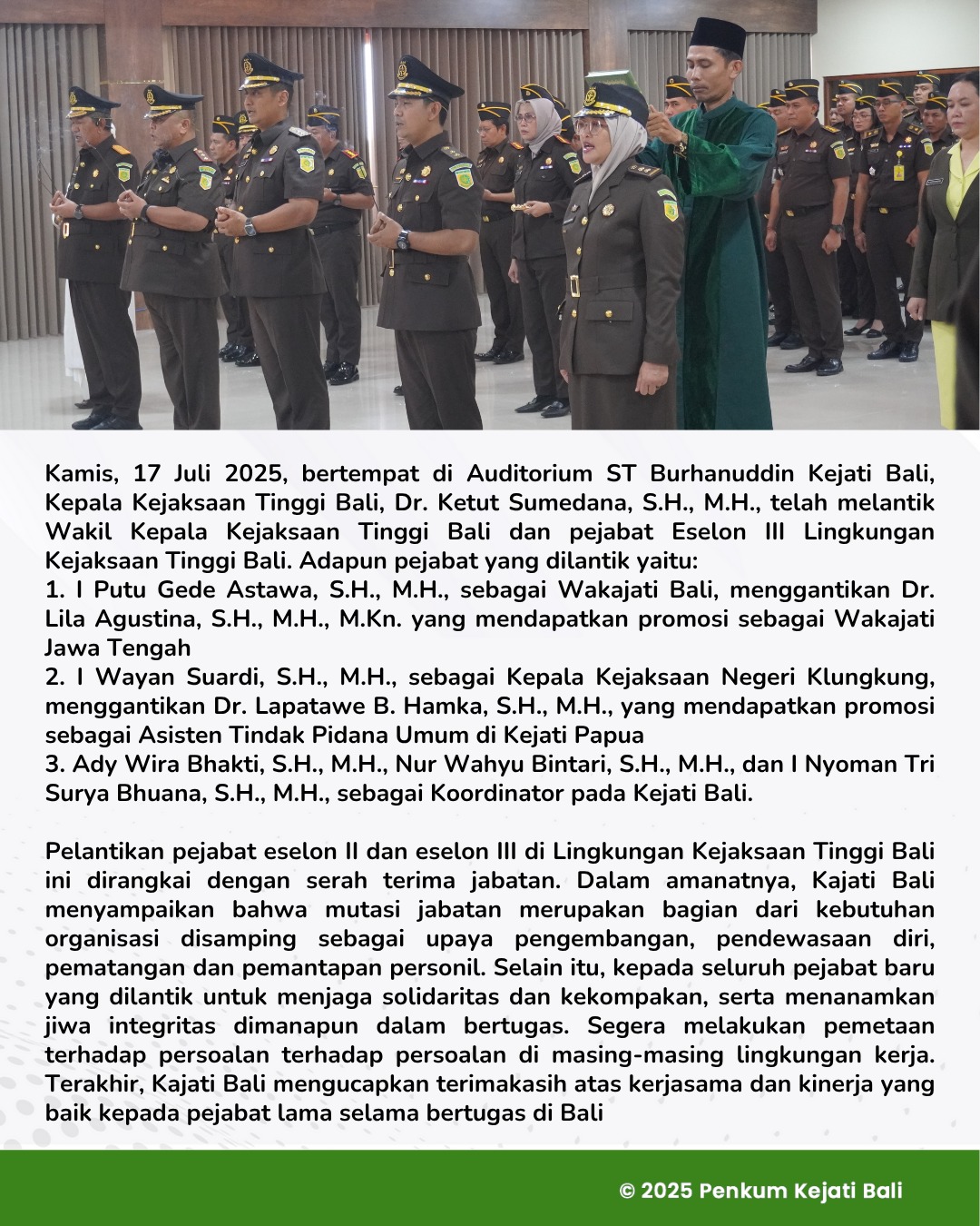 Kamis, 17 Juli 2025, bertempat di Auditorium ST Burhanuddin Kejati Bali, Kepala Kejaksaan Tinggi Bali, Dr. Ketut Sumedana, S.H., M.H., telah melantik Wakil Kepala Kejaksaan Tinggi Bali dan pejabat Eselon III Lingkungan Kejaksaan Tinggi Bali. Adapun pejabat yang dilantik yaitu: