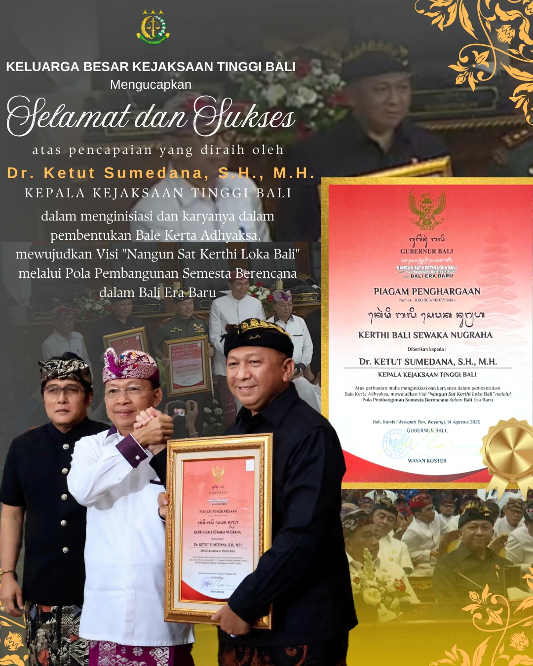 Selamat dan Sukses atas pencapaian yang diraih oleh Kepala Kejaksaan Tinggi Bali, Dr. Ketut Sumedana, S.H., M.H.