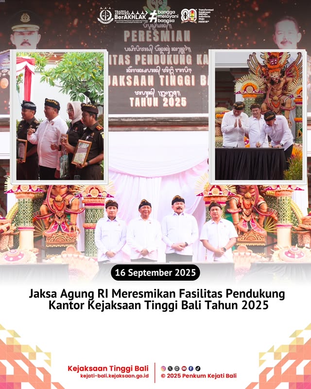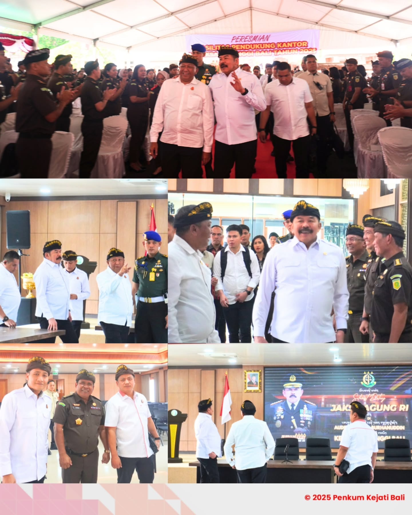 Jaksa Agung Republik Indonesia, ST Burhanuddin, meresmikan fasilitas pendukung Gedung Kantor Kejaksaan Tinggi Bali pada Selasa, 16 September 2025. Acara peresmian yang berlangsung di Denpasar ini disaksikan oleh Kepala Kejaksaan Tinggi Bali, Dr. Ketut Sumedana, S.H., M.H., Wakil Kepala Kejaksaan Tinggi Bali, I Putu Gede Astawa, S.H., M.H., pejabat utama Kejaksaan Agung, serta seluruh Asisten, Koordinator, para Kasi, dan seluruh pegawai Kejati Bali.