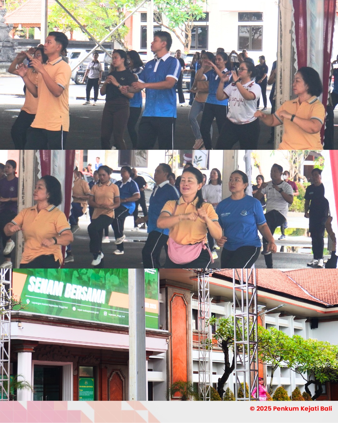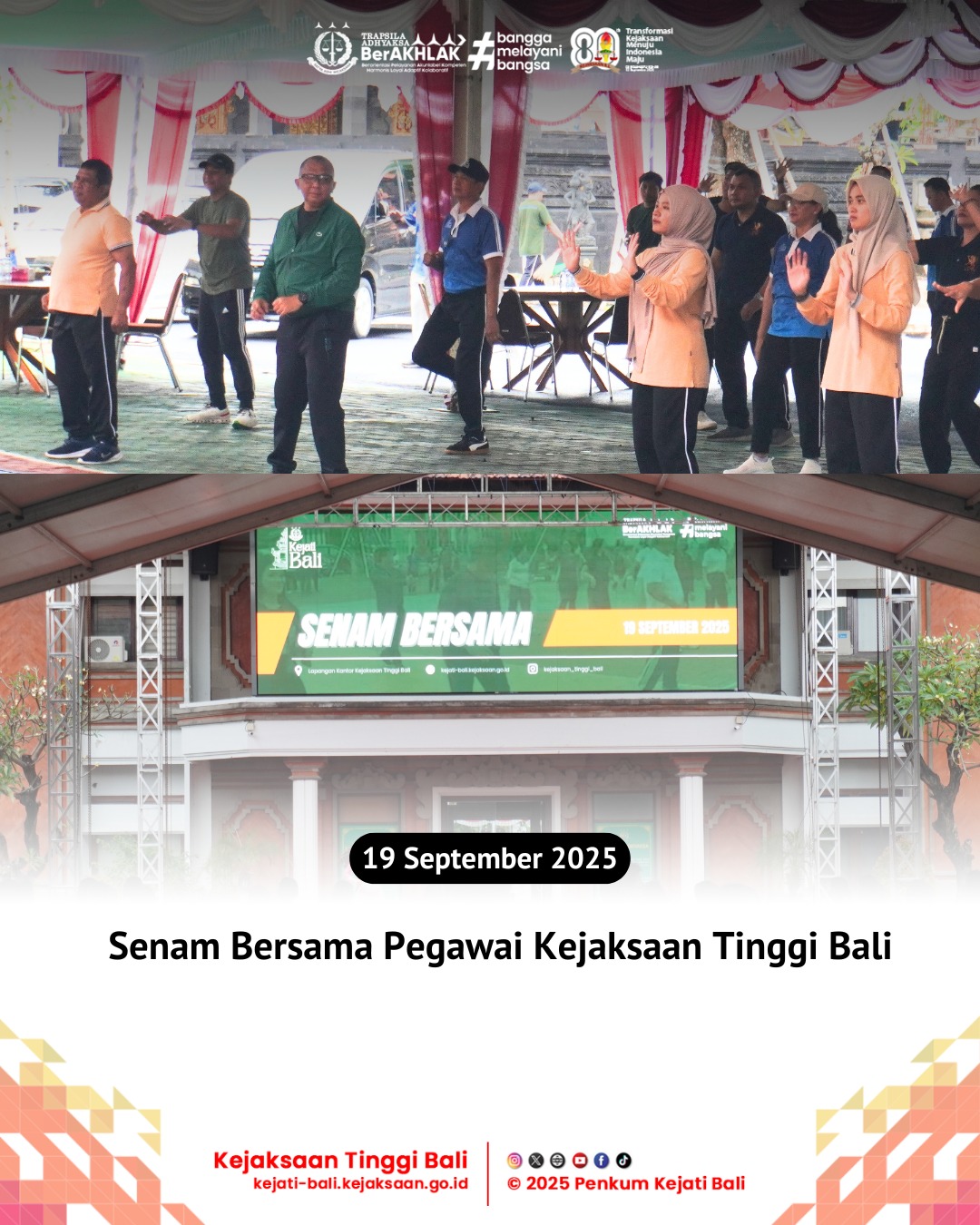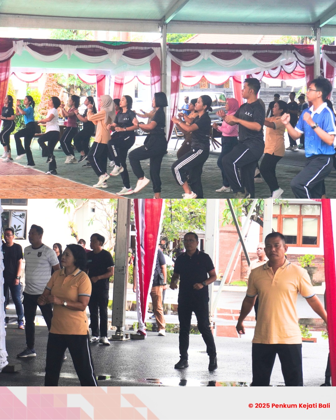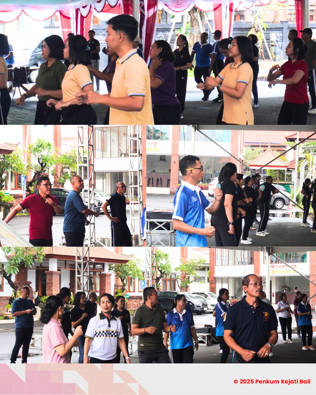 Dalam rangka mewujudkan pegawai yang sehat jasmani serta membangun semangat kebersamaan, Kejaksaan Tinggi Bali rutin melaksanakan kegiatan senam bersama, pada hari Jumat, 19 September 2025. Kegiatan ini tidak hanya bertujuan untuk menjaga kebugaran dan kesehatan fisik para pegawai, tetapi juga menjadi sarana mempererat tali silaturahmi, memperkuat kerja sama tim, dan membangun solidaritas di lingkungan kerja.
