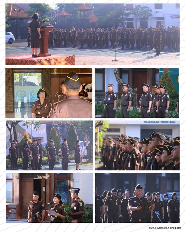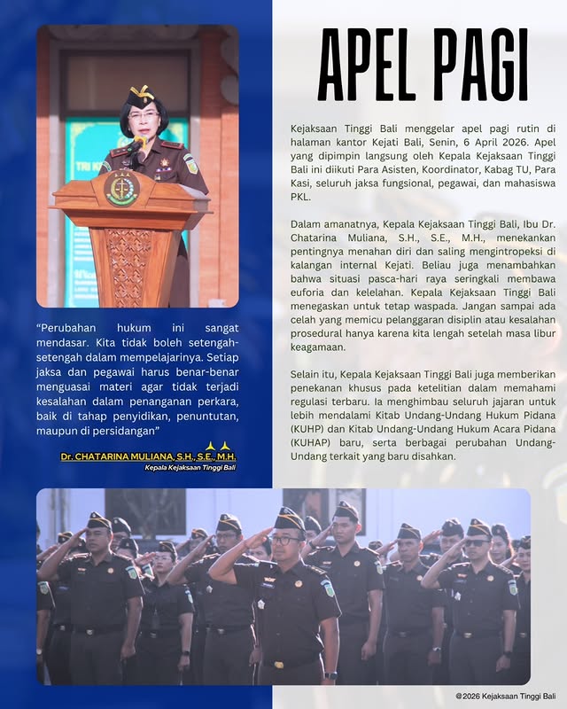 Kejaksaan Tinggi Bali menggelar apel pagi rutin di halaman kantor Kejati Bali, Senin, 6 April 2026. Apel yang dipimpin langsung oleh Kepala Kejaksaan Tinggi Bali ini diikuti Para Asisten, Koordinator, Kabag TU, Para Kasi, seluruh jaksa fungsional, pegawai, dan mahasiswa PKL.