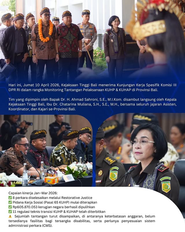 Hari ini, Jumat 10 April 2026, Kejaksaan Tinggi Bali menerima Kunjungan Kerja Spesifik Komisi III DPR RI dalam rangka Monitoring Tantangan Pelaksanaan KUHP & KUHAP di Provinsi Bali.