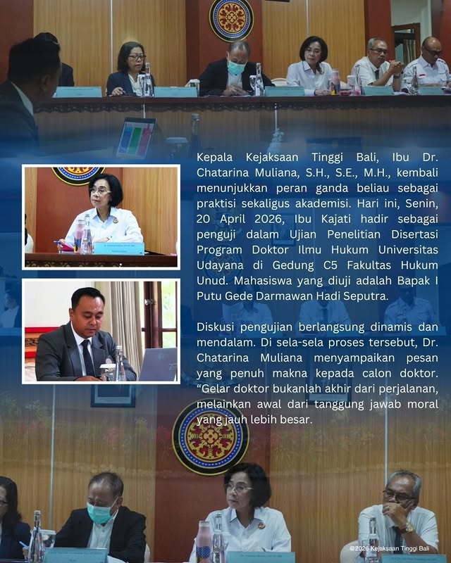 Kepala Kejaksaan Tinggi Bali, Ibu Dr. Chatarina Muliana, S.H., S.E., M.H., kembali menunjukkan peran ganda beliau sebagai praktisi sekaligus akademisi. Hari ini, Senin, 20 April 2026, Ibu Kajati hadir sebagai penguji dalam Ujian Penelitian Disertasi Program Doktor Ilmu Hukum Universitas Udayana di Gedung C5 Fakultas Hukum Unud. Mahasiswa yang diuji adalah Bapak I Putu Gede Darmawan Hadi Seputra.