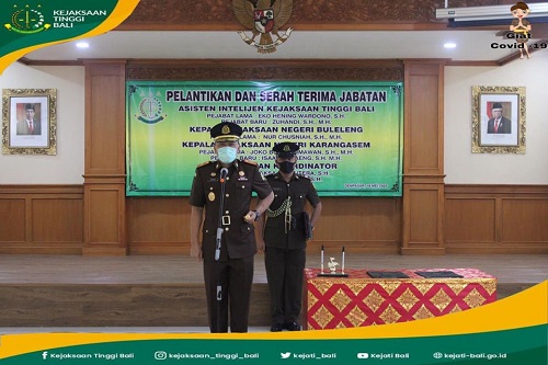 Bertempat di aula Sasana Dharma Adhyaksa, Kepala Kejaksaan Tinggi Bali, Idianto, SH., MH, memimpin upacara pelantikan dan serah terima jabatan Asisten Bidang Intelijen, Kepala Kejaksaan Negeri Karangasem, dan Koordinator pada Kejaksaan Tinggi Bali. Kegiatan Upacara ini dilaksanakan dengan memperhatikan protokol kesehatan Pencegahan Covid-19 dan dilaksanakan dengan sarana Video Conference di Kejari di Wilayah Hukum Kejati Bali.