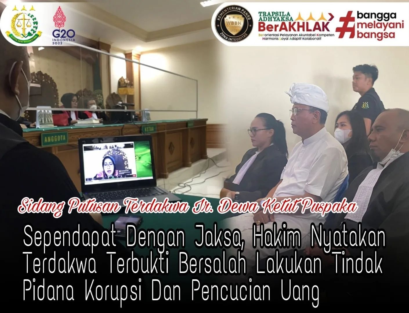 Persidangan Perkara Tindak Pidana Korupsi dan Tindak Pidana Pencucian Uang atas nama terdakwa Ir Dewa Ketut Puspaka, MP, memasuki tahap Pembacaan Putusan Pengadilan Oleh Majelis Hakim. Pada persidangan di Pengadilan Tindak Pidana Korupsi Pada Pengadilan Negeri Denpasar, Selasa, 26 April 2022, Majelis Hakim menjatuhkan putusan yang pada intinya menyatakan terdakwa Ir Dewa Ketut Puspaka, MP telah terbukti secara sah dan meyakinkan bersalah melakukan tindak pidana korupsi dan tindak pidana pencucian uang. Terdakwa Ir Dewa Ketut Puspaka, MP dijatuhi pidana penjara selama 8 (delapan) tahun dikurangi selama terdakwa berada dalam tahanan dan denda sebesar Rp. 1.000.000.000,- subsidiar 6 bulan kurungan.Terhadap putusan ini, baik Jaksa Penuntut Umum maupun terdakwa / Penasihat Hukum menyatakan pikir pikir.