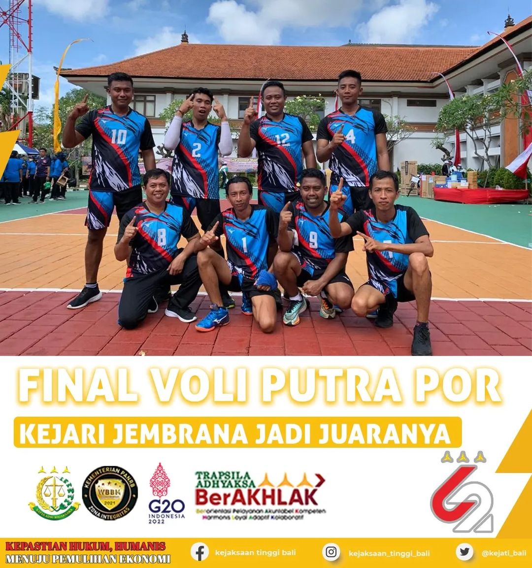 Setelah melalui pertarungan sengit, Tim Voli Putra Kejari Jembrana sukses mengalahkan Tim Voli Putra Kejari Denpasar, 25-21, 20-25 dan 15-9. Keberhasilan mengalahkan Kejari Denpasar menjadikan Kejari Jembrana menjadi juara Pertandingan Voli Putra Pekan Olahraga Adhyaksa ke-62 Kejati Bali. Juara Ketiga Diraih Tim Voli Putra Kejati Bali setelah mengalahkan Tim Voli Putra Kejari Gianyar